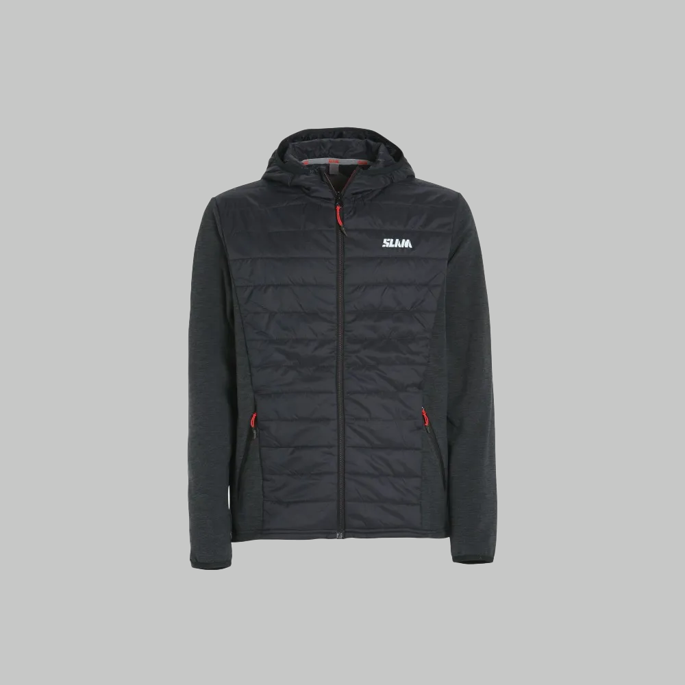 The Act Hybrid fleece is a men’s stretch sweatshirt with one part in soft, warm fabric (sleeves, sides, back) and another in padded nylon (hood and front body area).
