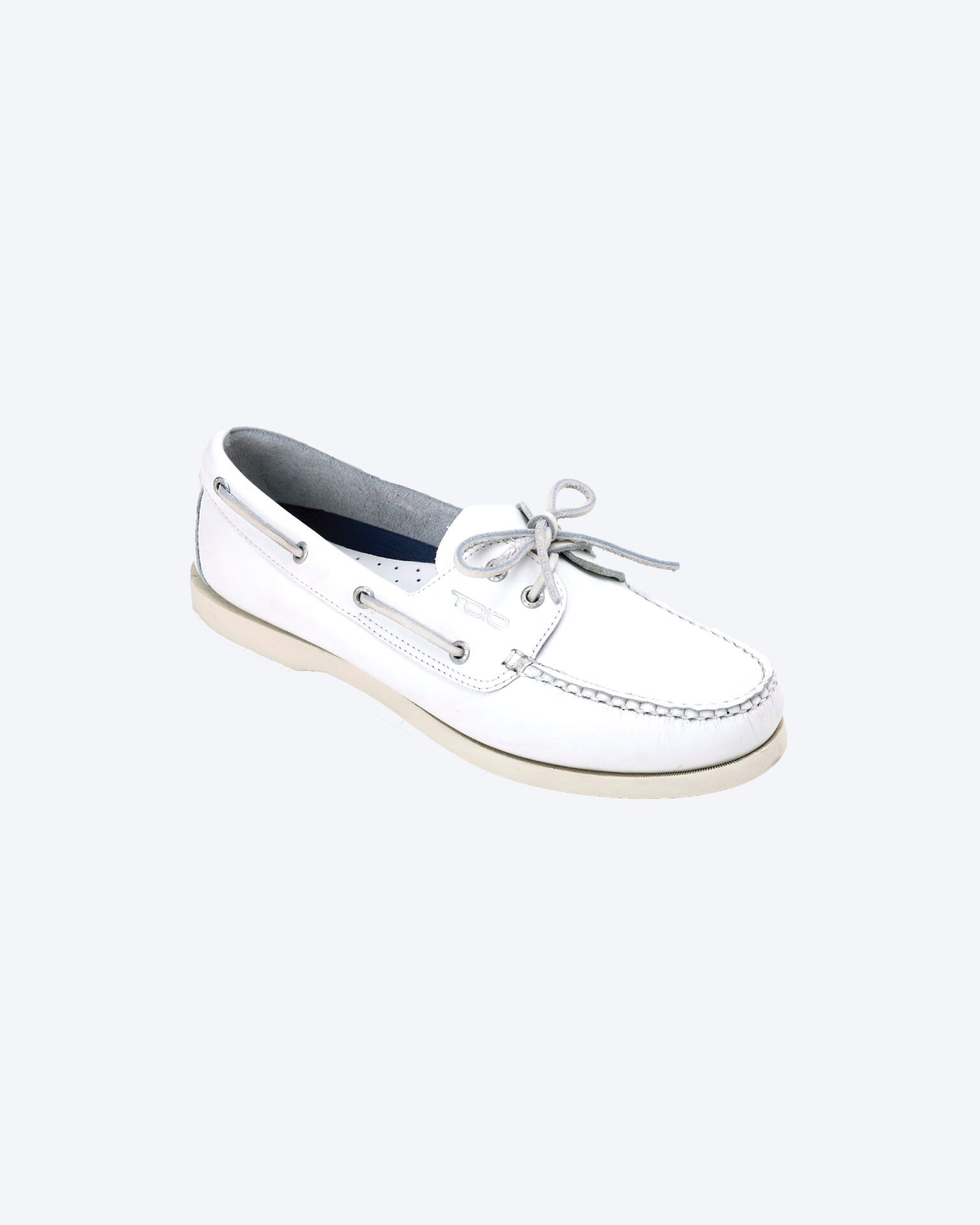 Leather boat shoe with laces and eyelets.