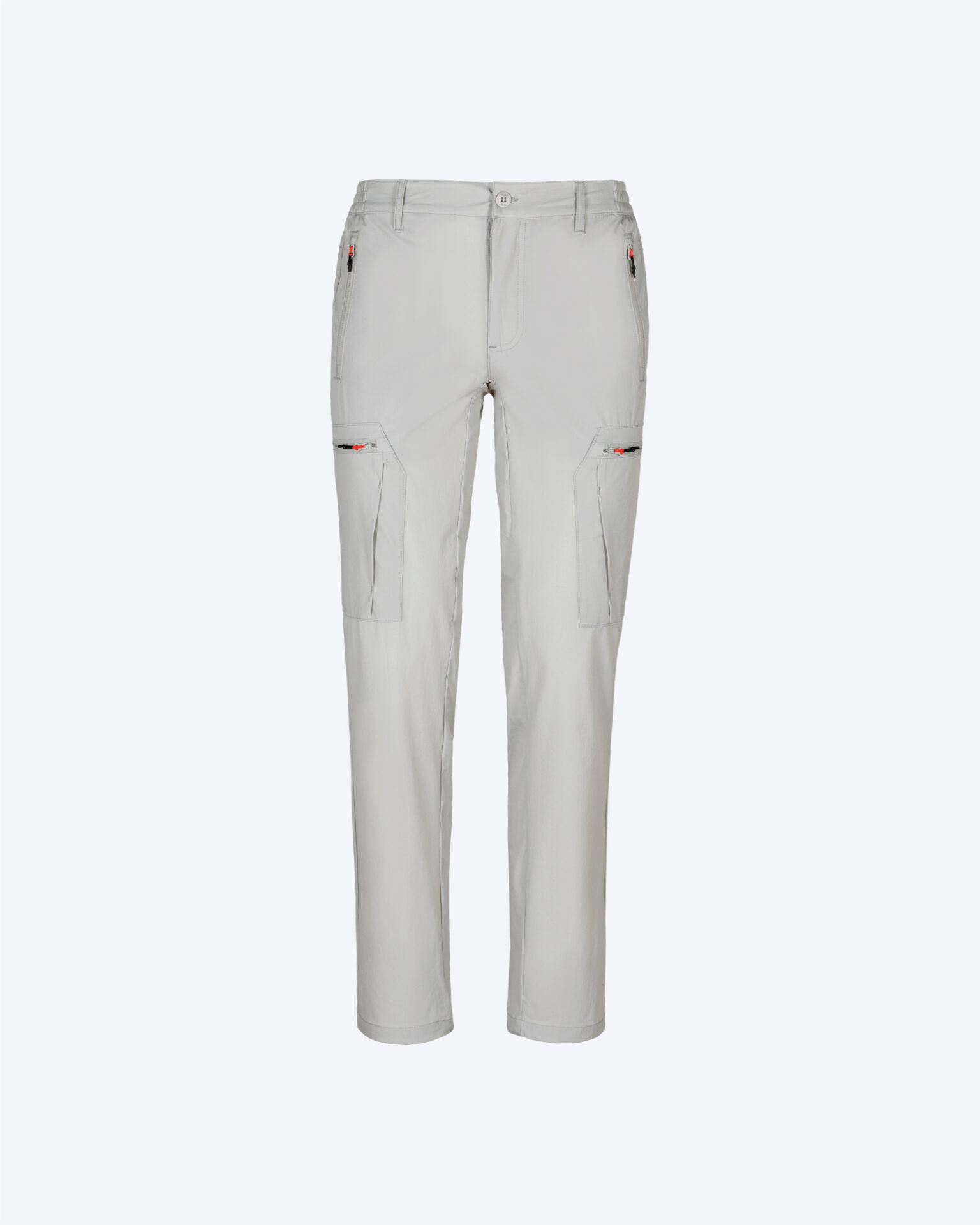 Tehničke cargo pantalone od brzo sušeće rastezljive tkanine. Elastična traka u struku i pet džepova sa rajsferšlusima.