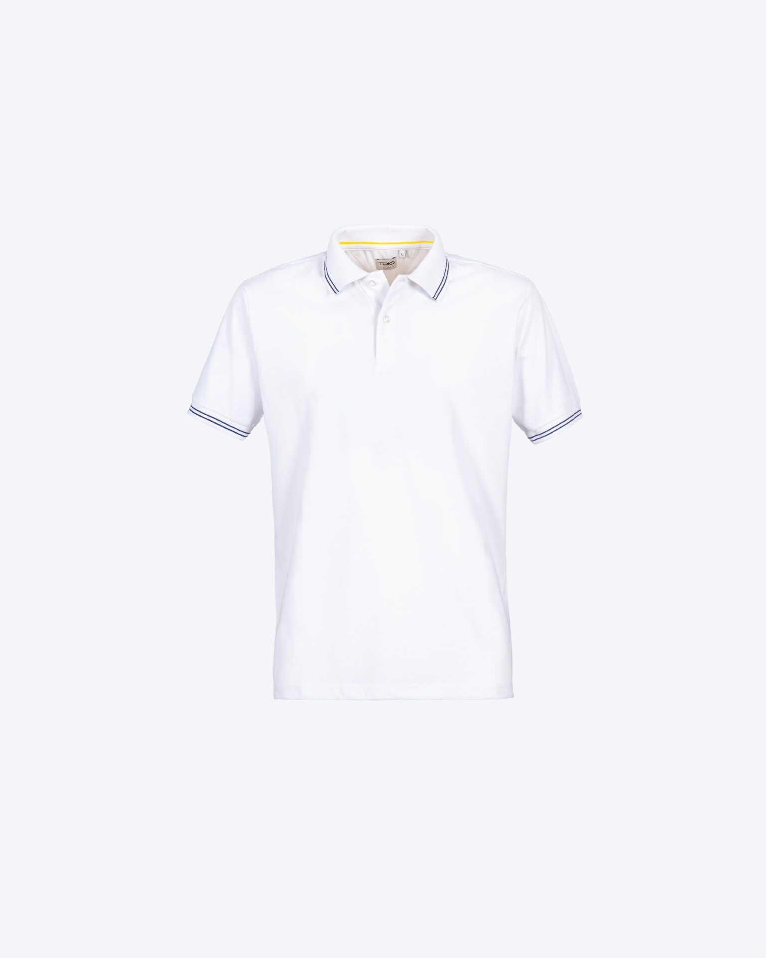 Polo majica kratkih rukava sa ranflom na kragni i na rubu rukava. Otvaranje sa dva dugmeta. Kragna, unutrašnji dio otvora i rub rukava sa kontrastnim prugama. Udoban piqué materijal.