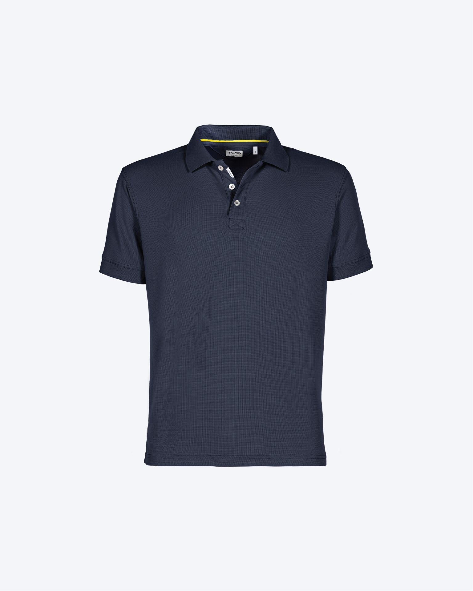 Polo majica kratkih rukava od tehno piké tkanine sa rebrastom kragnom i manžetnama u odgovarajućoj boji. Tri dugmeta na prednjem otvoru.